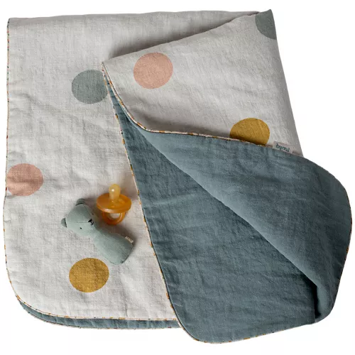 De kinderdeken van linnen ramie heeft aan de ene zijde een lieflijk stippenpatroon. De andere kant is effen zeegroen.
