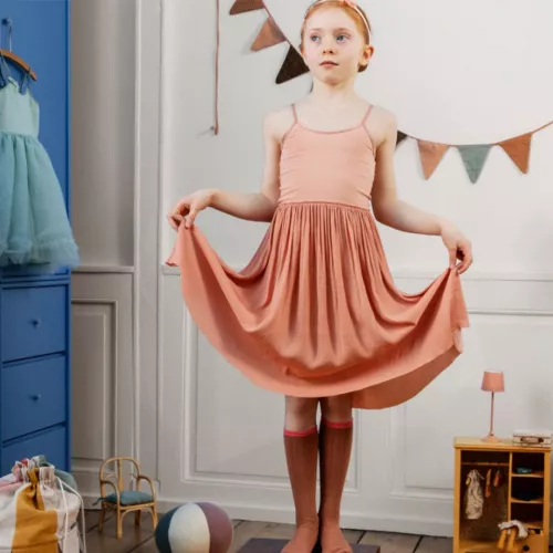 De stijlvolle kinderjurk van zachte, soepel vallende stof, heeft een katoenen lijfje met spagettibandjes en een elegante, royaal gerimpelde rok die iets uitloopt en sierlijk zwiert bij het dansen.