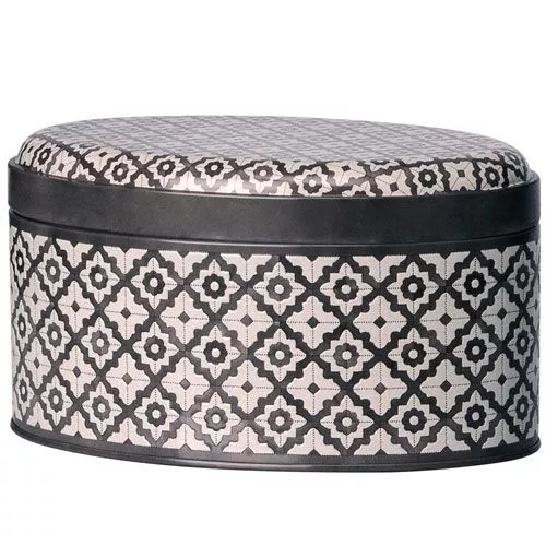 De nostalgische opbergtrommel lijkt zó van grootmoeder’s tafel te komen. De ovalen blikken opbergdoos ‘Sweet Delight’ van het Deense merk Maileg heeft een donkerbruin geometrisch patroon met een bloemetje.