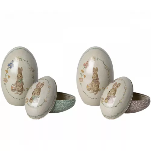 Een twee-delige paasei set ‘Easter Eggs’ van het Deense merk Maileg, bestaande uit een groot en een klein blikken ei. De decoratieve blikken kunnen gevuld kunnen worden met kleinigheidjes of chocolade. Van oudsher is het een traditie om met Pasen een paasei als geschenk mee te brengen.