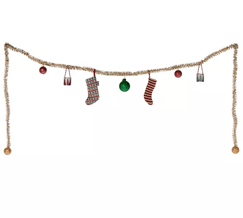 Een glinsterende kerstslinger ‘Christmas Garland’ van het Deense merk Maileg om de kerstfeer in huis te halen. Met zeven handgemaakte, feestelijke ornamenten; twee trommels, twee kousen en drie kerstballen. Aan de uiteinden van de kerstslinger hangen twee gouden kerstballen.