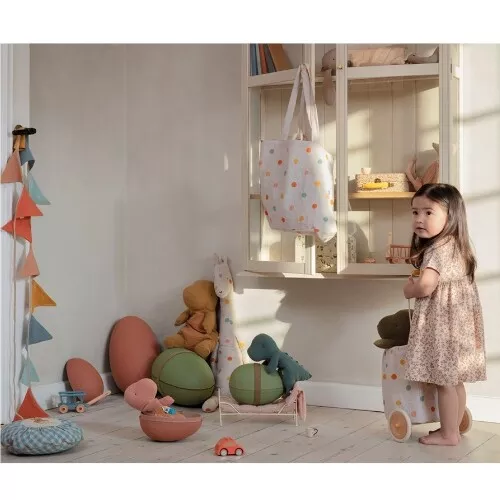De innemende, linnen dinoknuffel wordt geleverd in een kartonnen ei met een decoratief elastiek dat het ei bijeenhoudt. Zo is het uitpakken van dit cadeautje extra verrassend.