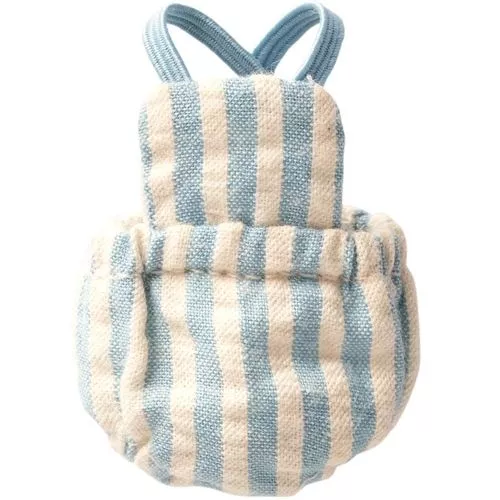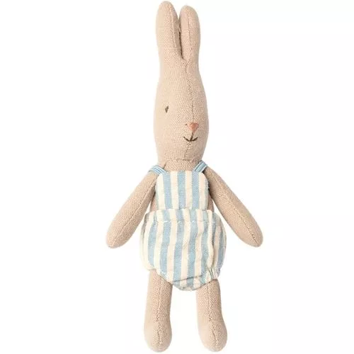 Het kleine knuffelkonijn ‘Bunny’ van het Deense merk Maileg in een blauw gestreept poppenpakje.