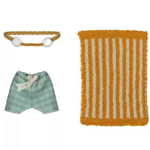 Met dit zomerse speelgoedsetje van het Deense merk Maileg heeft een muizenknuffel alles bij de hand voor een heerlijke strandvakantie: een zwembroek, zwembrilletje en een handdoek.