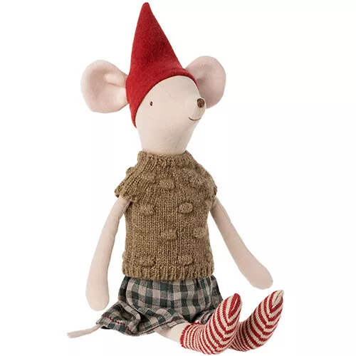 Een feestelijk knuffelmuisje ‘Christmas Mouse, Medium – Girl’ van het Deense merk Maileg om te omarmen en te knuffelen. Dit muisje draagt een warme trui, geblokte rok, warme gestreepte kousen en een rode kerstmuts.