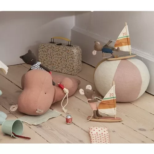 Knuffelmuis ‘Beach Mice – Surfer Little Brother’ van het Deense merk Maileg is goed voorbereid op een dagje op het water. Gekleed in een wetsuit bedwingt hij met zijn windsurfboard iedere golf.
