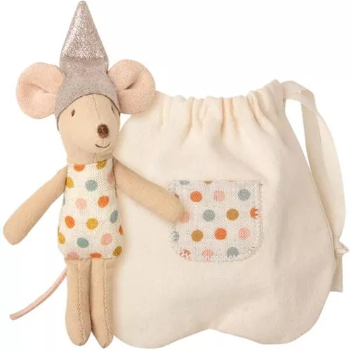 Een kleine knuffelmuis ‘Little Mouse Tooth Fairy’ met een bewaarzakje van het Deense merk Maileg. Het vertederende tandenfeemuisje past op de melktandjes die in het katoenen tandzakje veilig bewaard kunnen worden.Â