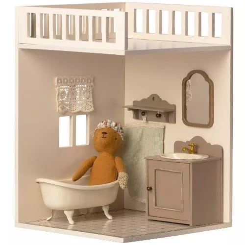 Een houten poppenhuis kamer ‘House of Miniature – Bathroom’ uit de serie House of Miniature van het Deense merk Maileg. De ongemeubileerde poppenbadkamer heeft een tegelpatroon op de vloer en kanten vitrage voor het raam. Zo kunnen de poppenhuisbewoners hun kamer naar eigen inzicht inrichten.