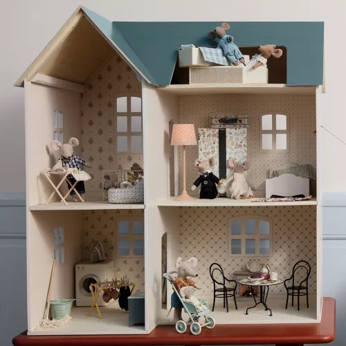 Een houten poppenhuis ‘House of miniature’ van het Deense merk Maileg met klassieke hoge ramen voor de kleine konijnen en de muizenfamilie. De muren van de poppenhuiskamers zijn vrolijk behangen met nostalgische patronen.
