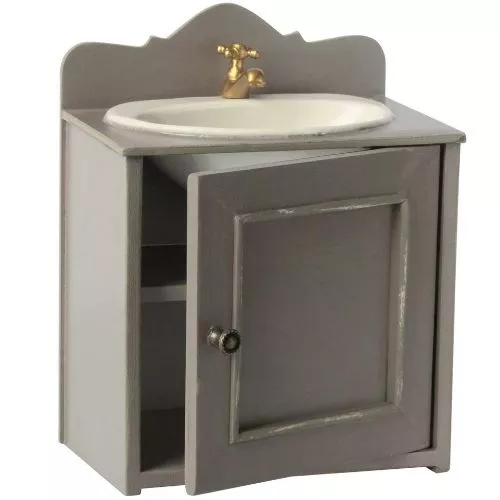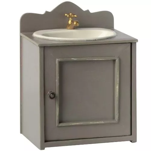 Poppenhuisbewoners wanen zich in vervlogen tijden met deze houten poppenwastafel ‘Miniature Bathroom Sink’ van het Deense merk Maileg. Met zijn gouden kraantje, metalen wasbak en sierlijk gebogen houtsnijwerk voegt de speelgoedwastafel een vleugje nostalgie toe aan het poppenhuis. Met kastruimte voor poppenhanddoeken en andere benodigdheden.