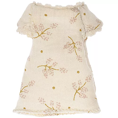 Deze lieflijke poppennachtpop van het Deense merk Maileg voor de kleine zus knuffelmuis, is eigenlijk te mooi om alleen voor het slapen te dragen. De knuffelmuis kan hierin ook naar een gezellig pyjamafeestje