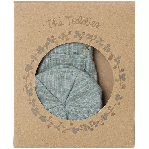 Beren willen ook af en toe een beetje casual gekleed gaan. Met deze poppenkleding ‘Overall and cap for Teddy Junior’ van het Deense merk Maileg hult berenknuffel Teddy Junior zich in een blauwe overall met een klein borduusel en met bijpassende pet.