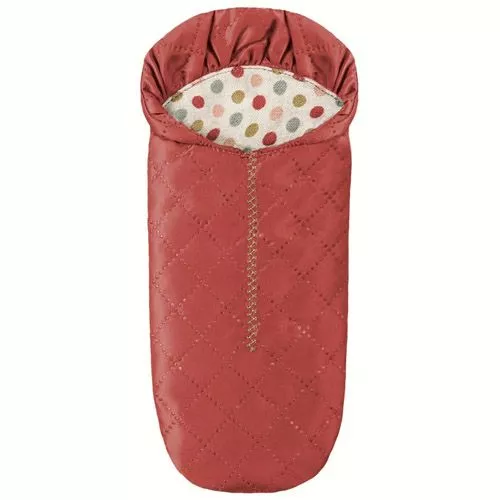 Een kleine, rode polyester poppenslaapzak voor de avontuurlijke muizen van het Deense merk Maileg.