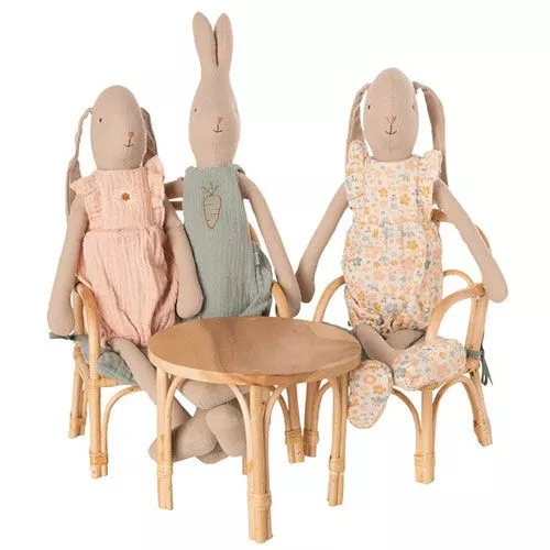 Voor een knuffel die er graag eventjes bij komt zitten, deze handgemaakte poppenstoel van rotan van het Deense merk Maileg. Met een kussentje voor extra comfort voor de tere knuffelbilletjes.