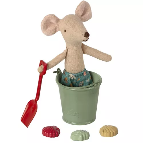 Met dit strandspeelgoed op poppenhuisformaat ‘Beach Set’ van het Deense merk Maileg zijn knuffelmuizen en andere kleine popjes goed voorbereid op een dagje strand. De kleine poppenstrandset bestaat uit een schep, een emmer en drie zandvormpjes.