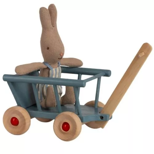 Een kleine bolderwagen is onmisbaar om knuffeltjes in te vervoeren. De poppentrekkar op poppenhuisformaat ‘Wagon – Blue’ voor de kleine microkonijntjes en kleine muisjes van het Deense merk Maileg is een gezellige kar om ze mee op stap te nemen.