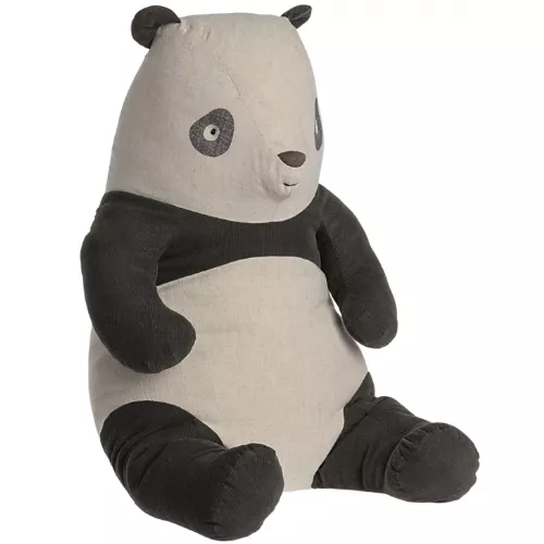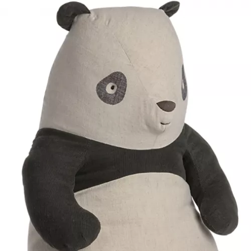 De pandaknuffel heeft geborduurde oogjes omgeven door gedrukte, karakteristieke pandavlekken. De zwarte delen van zijn vacht zijn gemaakt van babycorduroy, wat een verrassend textuurverschil geeft met de rest van zijn lijf.